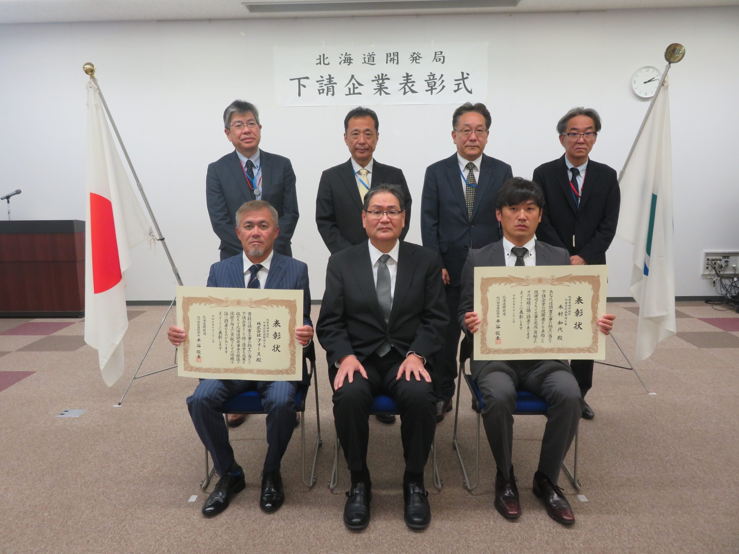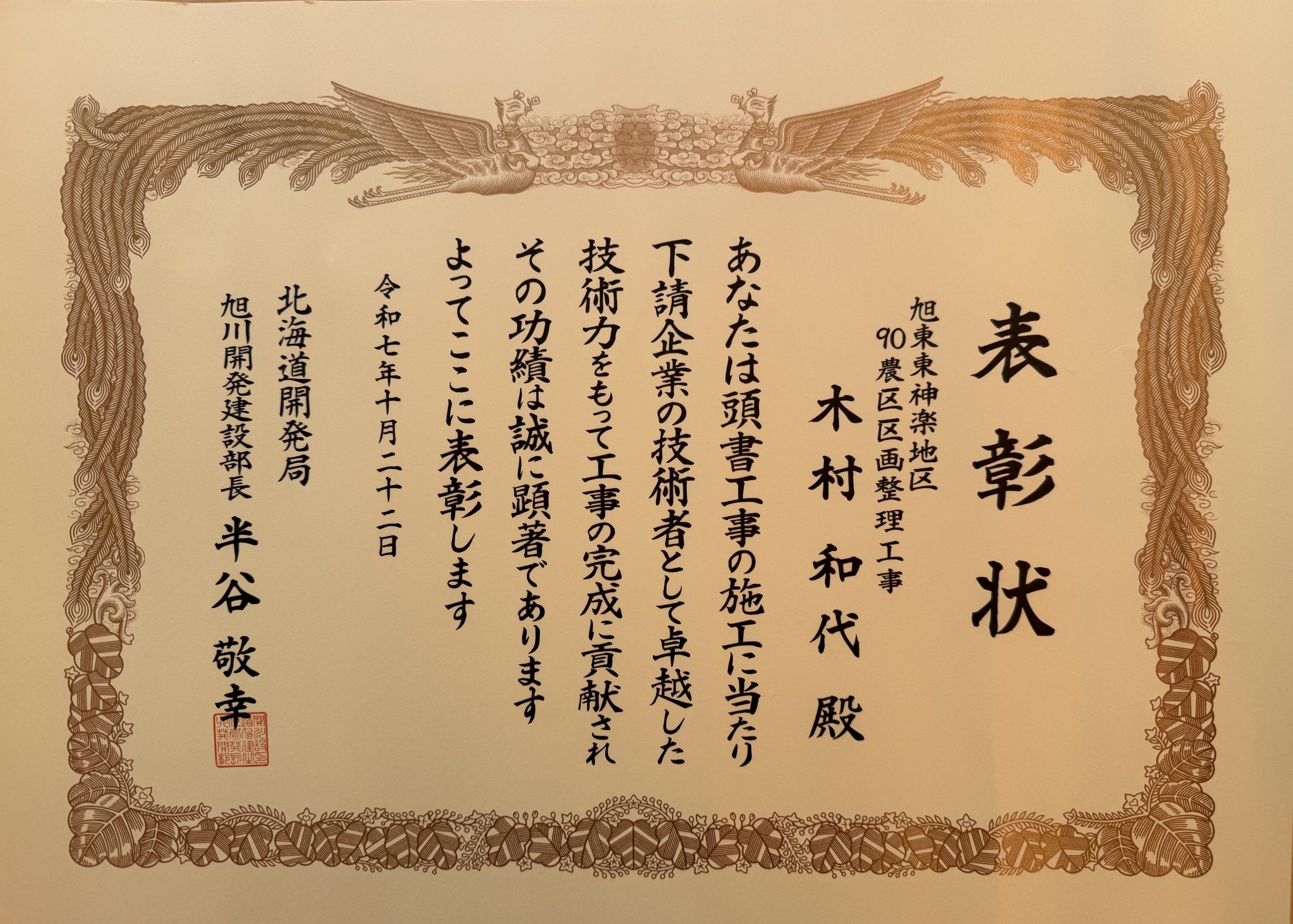 下請企業表彰(2回目) Posted by f on 2025年10月30日 令和7年10月22日、北海道開発局下請企業表彰で令和6年度 旭東東神楽地区 90農区区画整理工事(元請:タカハタ建設株式会社)を下請施工した弊社株式会社フォース及び専任技術者 木村 和代(キムラ カズヨ)が旭川開発建設部長賞を受賞いたしました。 北海道開発局下請企業表彰は、開発建設部が発注した優良な工事において、下請企業及び専任技術者を表彰するものです。 今後も、今回の受賞を励みにお客様に喜んでいただける仕事を心がけ、地域社会の発展に寄与できるよう、より一層努めてまいります。